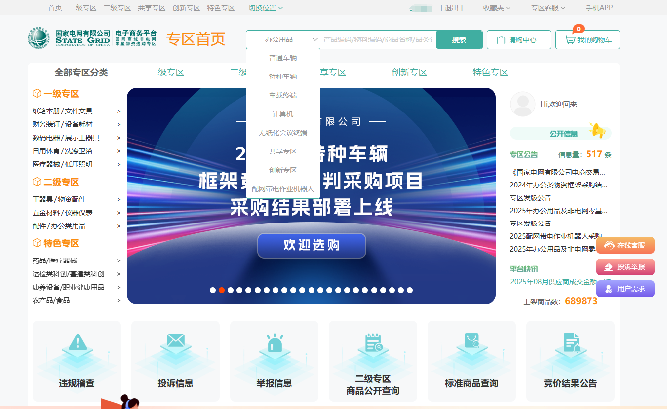 专区首页搜索框增加“办公用品、普通车辆、特种车辆、计算机、共享专区、创新专区下拉选项,办公类物资支持商品名称、物料编码、品类名称、产品编码等搜索条件。
